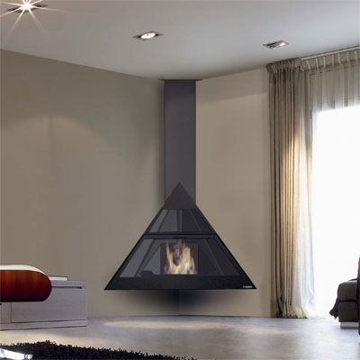 Угловой камин со стеклянной дверцей, с верхним подключением.