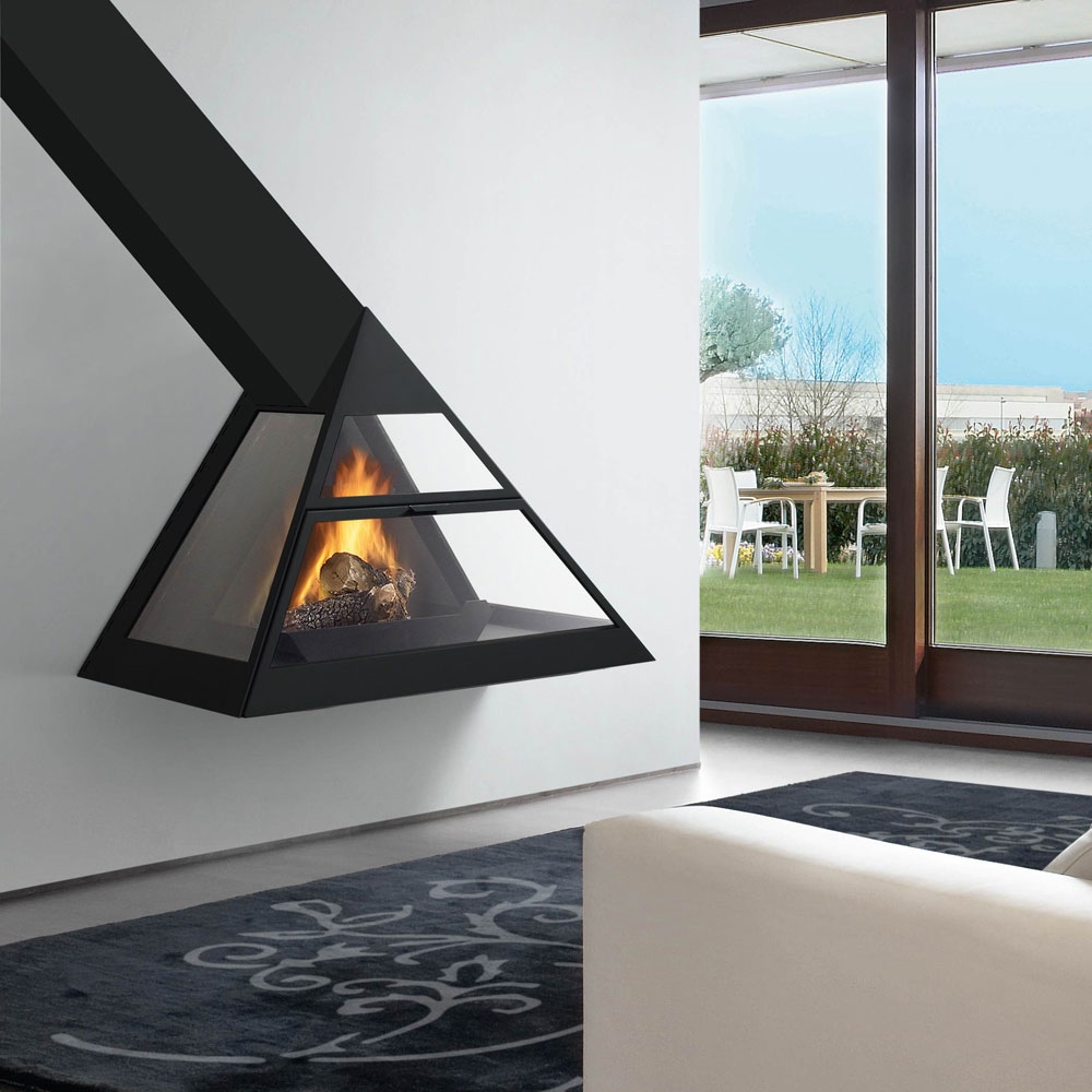 Фронтальный камин с наклонной трубой влево, со стеклом. Цвет - черный. Система двойного дожига.