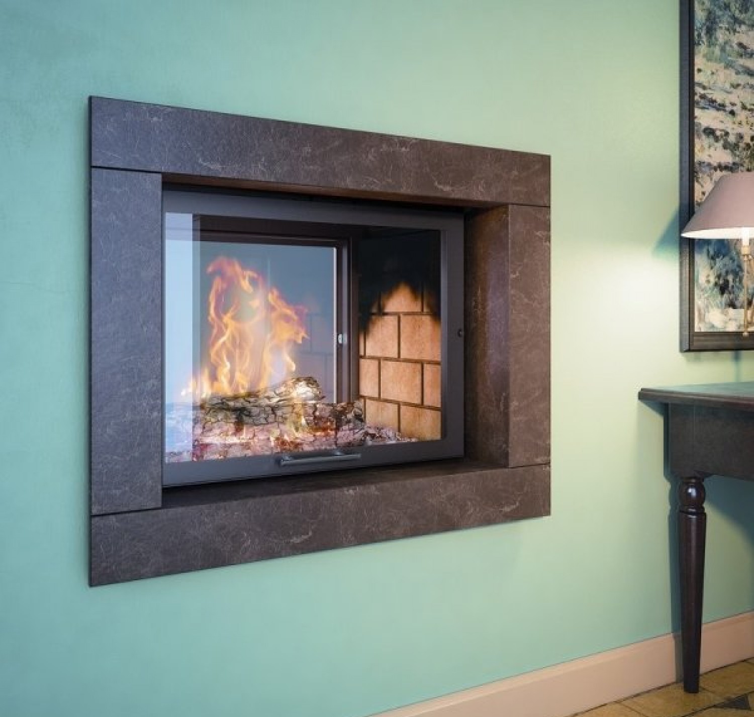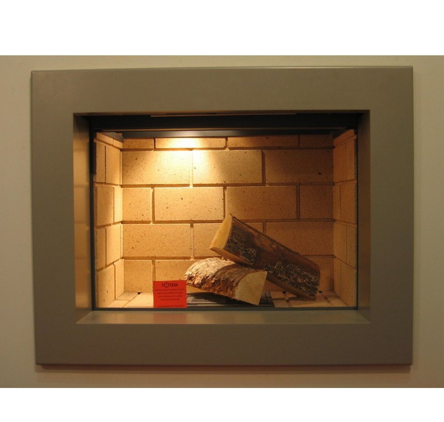 Каминная топка оснащена системой очистки стекла, встроенным шибером и системой подводки внешнего воздуха в камеру сгорания, а также оборудована цепным механизмом подъема двери, съемной колосниковой решеткой и ножками, которые дадут возможность установить топку на неровной поверхности.